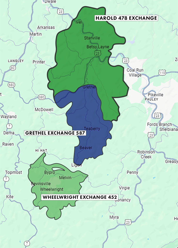 Gearheart Home Telephone has been servicing the fine folks of Wheelwright, Harold and Grethel for the past 65+ years and were not slowing down. We pride ourselves in offering the BEST in Telephone, Broadband and Digital TV in Eastern Kentucky. The map of our Coalfields Telephone and Broadband Service Area is bellow.